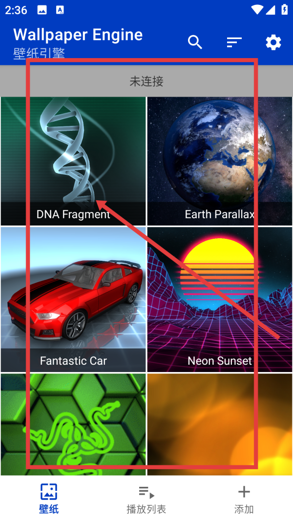 1、打開應用進入壁紙瀏覽界面,這里展示了眾多壁紙選項,找到你想要加速的那張壁紙,比如圖中的DNA Fragment,點擊該壁紙進入詳細設置頁面。
