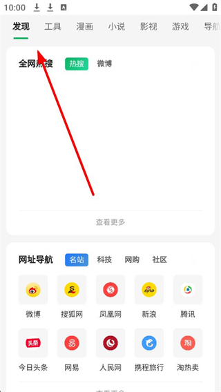 2、發現界面,能看到發現、工具、漫畫等欄目,點擊小說欄目進入小說界面。