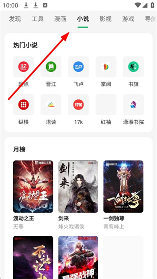 3、小說界面,可看到熱門小說平臺入口和月榜小說推薦,選擇感興趣的小說平臺或月榜小說,點擊進入相關界面。