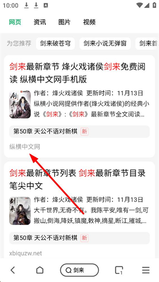 4、若要搜索特定小說,首頁搜索框輸入小說名稱,如劍來,即可看到相關搜索結果,點擊結果可進入閱讀頁面。