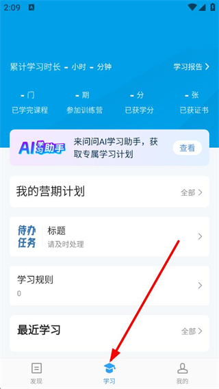2、進入學習板塊,可查看累計學習時長、已學完課程等學習數據,獲取AI學習助手專屬學習計劃,管理我的營期計劃和待辦任務,查看最近學習內容。