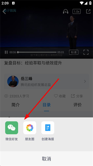 4、學習課程時,可調整播放速度和畫質,將課程分享給微信好友、朋友圈或創建海報,與他人分享學習資源。