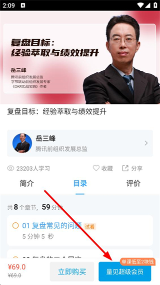 3、選擇課程后,可查看課程簡介、目錄和評價,選擇立即購買或開通量見超級會員暢享課程,開啟學習之旅。
