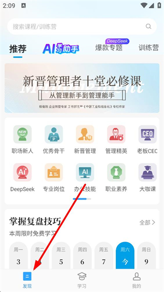1、進入發現板塊,可搜索課程或訓練營,查看推薦、AI學習助手等內容,選擇職場新人、優秀骨干等不同學習分類,參與限時免費學習活動。