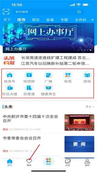 2、成功登錄后進入首頁,可使用政務號、短視頻等功能入口,瀏覽頭條資訊,獲取當地政務、新聞等相關信息,體驗綜合服務板塊。