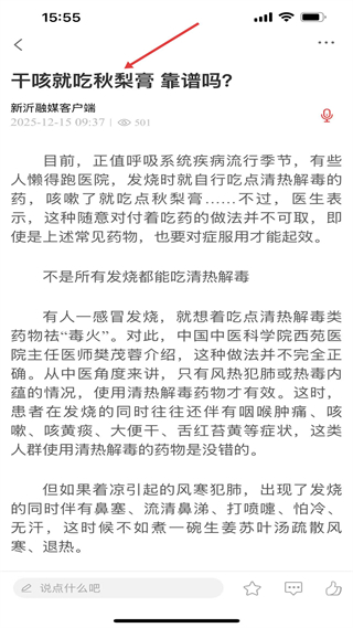 4、選擇具體文章查看詳情,比如了解干咳吃秋梨膏是否靠譜的內容,學習對癥用藥等健康知識,還可進行評論、點贊等互動操作。