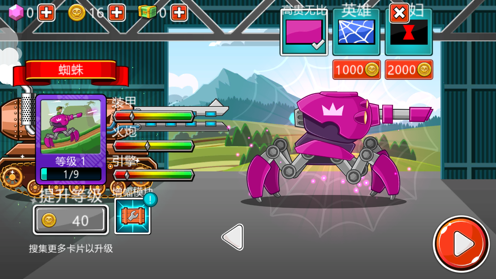 3、玩家還可在坦克升級的界面,可花費金幣提升蜘蛛坦克的裝甲、火炮、引擎等屬性加強自己的戰斗力。