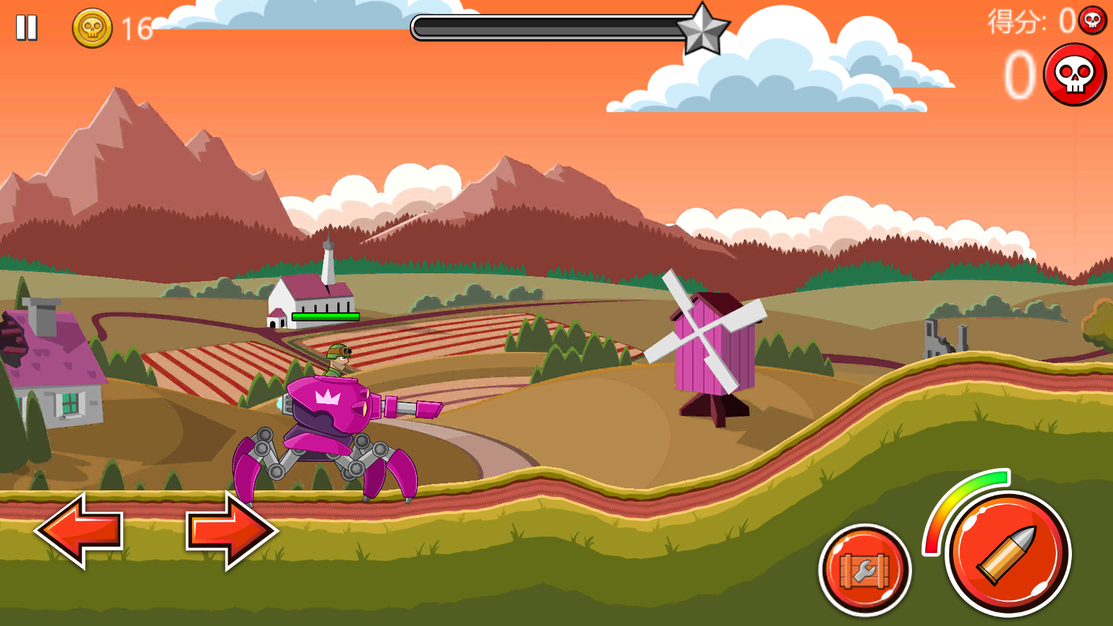 4、進入游戲場景,操控坦克在地形上移動,利用左右箭頭按鈕控制方向,右側有維修和射擊按鈕,完成任務。