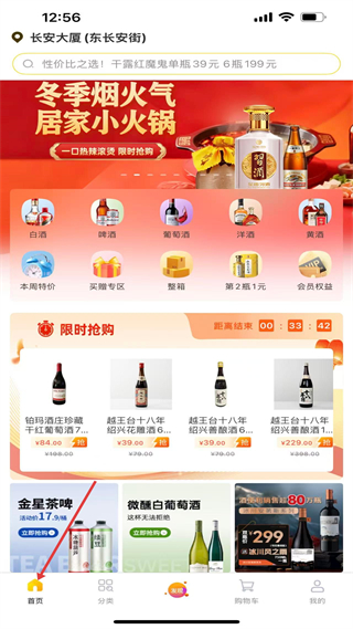 2、首頁設搜索欄,有冬季煙火氣居家小火鍋活動,分類涵蓋白酒、啤酒等,限時搶購板塊展示多款優惠酒品。