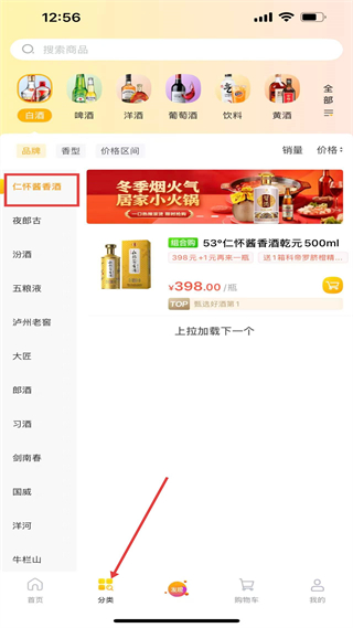 3、分類頁可按白酒、啤酒等品類及品牌如五糧液、劍南春等篩選,方便用戶查找心儀酒品,如53仁懷醬香酒乾元等。