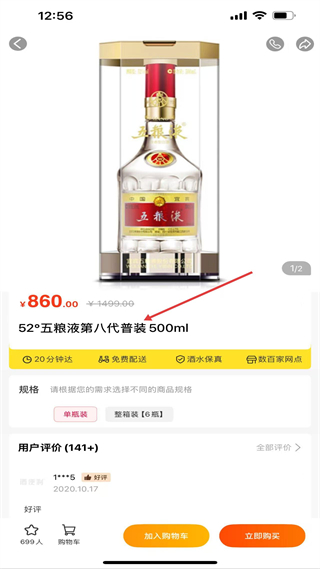 4、商品詳情頁展示52五糧液第八代普裝500ml,售價860元,支持加入購物車或立即購買,有20分鐘送達、酒水保真等服務。