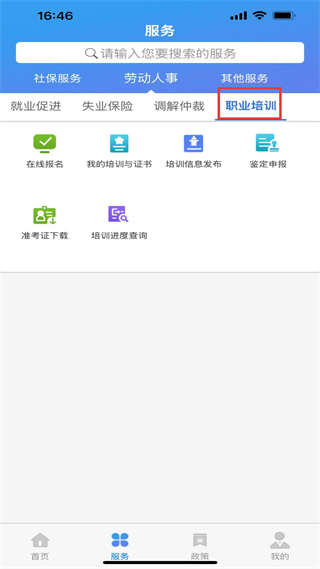 4、職業培訓界面涵蓋在線報名證書管理功能,支持培訓進度查詢,助力勞動者提升技能適配發展需求。