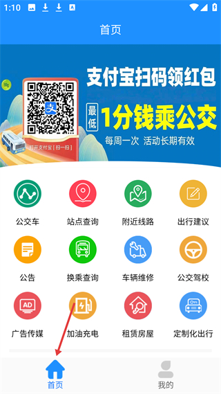 2、首頁,有支付寶掃碼領公交紅包廣告,包含公交車、站點查詢等多個功能模塊,底部有首頁和我的導航欄。