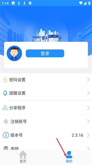 3、我的頁面功能清晰,提供登錄入口,支持密碼設置調整賬戶安全,提醒設置可自定義到站提醒規則,分享程序方便好友使用。