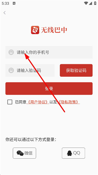 3、進入登錄界面顯示無線巴中標識,設有手機號驗證碼輸入框,還有微信QQ等登錄方式,可選擇方式完成登錄步驟。