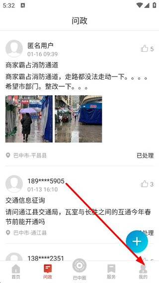 1、進入問政界面可見用戶的問政內容,包含商家霸占消防通道反映、交通信息咨詢等,可點擊我的進入對應板塊開展后續操作。