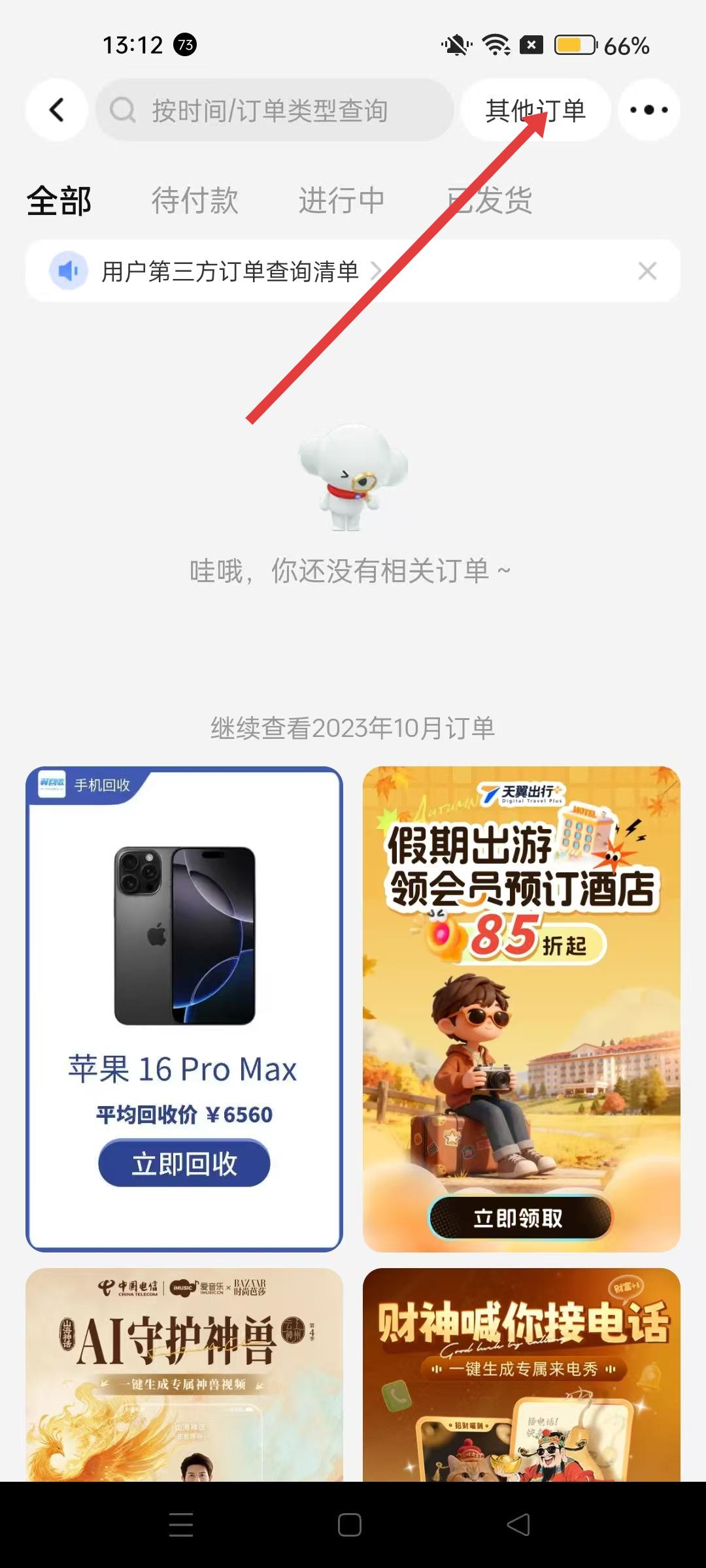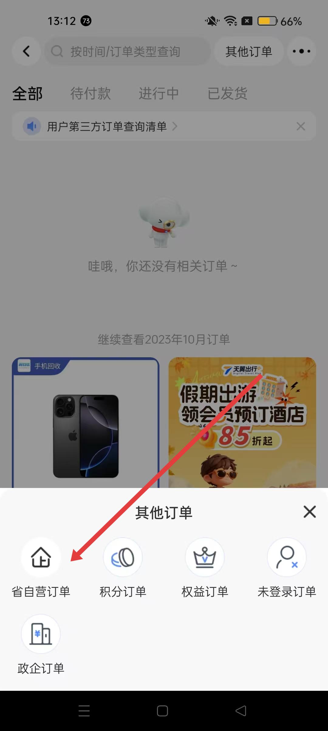 3、訂單查詢頁面點擊其他訂單,可查看省自營訂單、積分訂單等不同類型的訂單,方便用戶分類查詢。