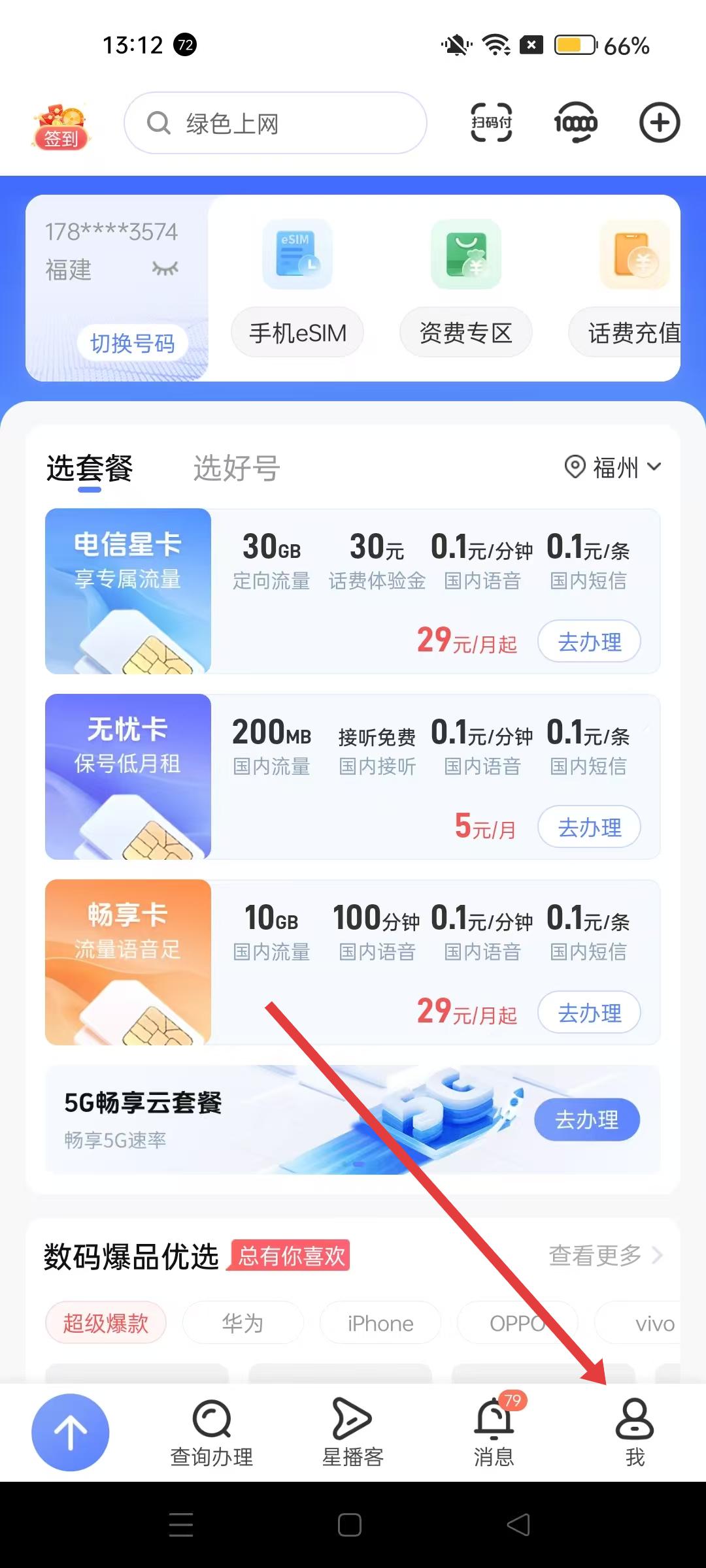 1、打開中國電信APP進入首頁,點擊右下角我,進入個人頁面,開始訂單查詢流程。
