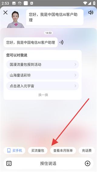4、在AI客戶助理頁面,可選擇功能選項如買流量包、查看本月賬單等,快速獲取相關服務,也可按住說話按鈕,通過語音與AI客服交流,解決問題或辦理業務。