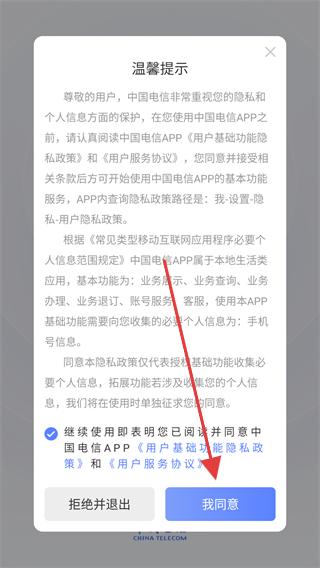 1、打開軟件在溫馨提示頁面點擊我同意按鈕,同意中國電信的隱私政策和用戶服務協議。