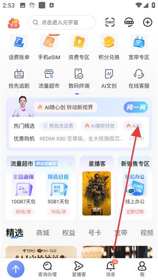 3、在首頁點擊AI問按鈕,進入中國電信AI客戶助理頁面,可選擇推薦的問題如國漫流量包報到活動等。