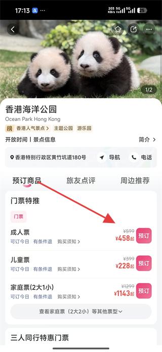 1、找到香港海洋公園頁面,瀏覽預訂商品板塊,選擇門票特推中的門票,點擊預訂進入門票選擇頁面。