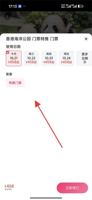 2、在門票選擇頁面,選擇使用日期,如今天10.21,確認套餐為特惠門票,點擊立即預訂進入訂單填寫頁面。