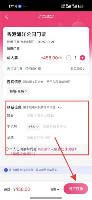 3、在訂單填寫頁面,填寫游客信息、聯系信息,包括姓名、手機號、郵箱等,勾選同意相關協議,點擊提交訂單。