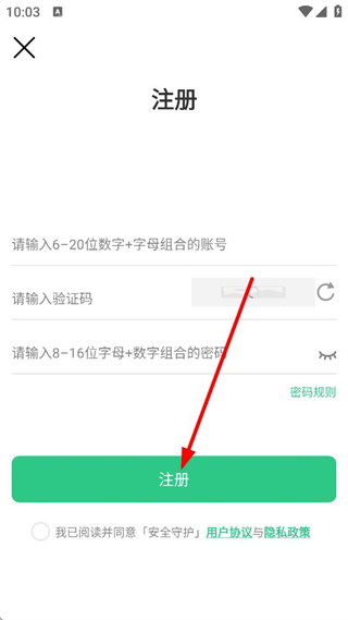 3、進入注冊頁面,按要求填寫賬號,輸入驗證碼,設置字母數字組合的密碼,勾選相關協議后點擊注冊按鈕,完成賬號創建。