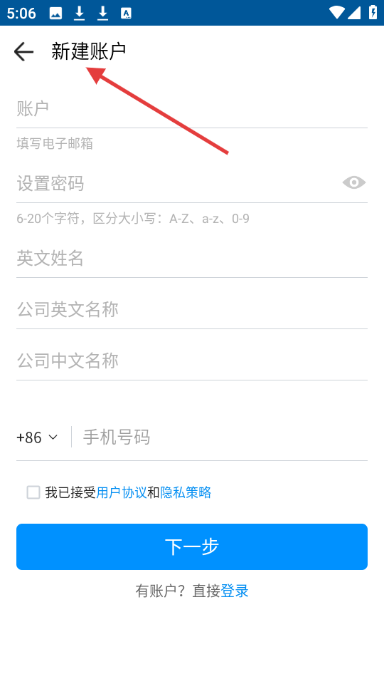 2、新建賬戶界面需填寫電子郵箱、設置密碼,以及英文姓名、公司名稱和手機號等信息,勾選協議后可下一步。