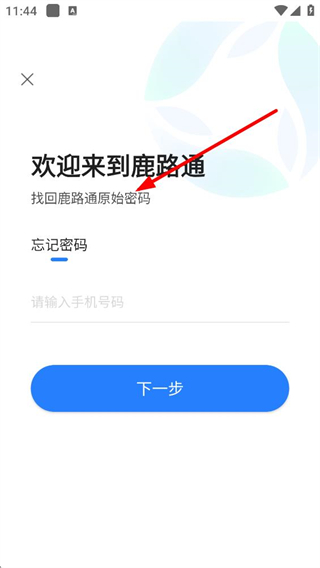 2、若忘記密碼,可進入忘記密碼界面,輸入手機號碼,點擊下一步,按照提示找回鹿路通原始密碼。