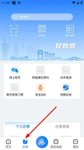 4、點擊辦事進入辦事界面,可進行線上取號、辦件查詢等操作,使用同城通辦預約、數字政務門牌等服務,方便辦理各類政務事項。