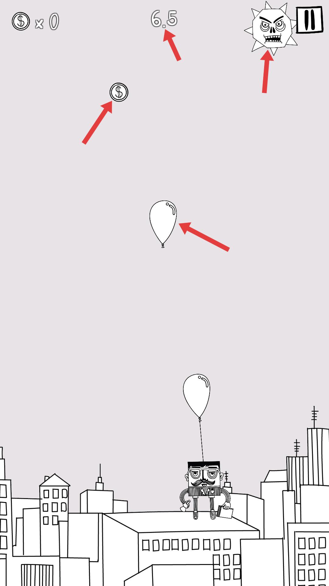 3、角色在空中移動時,要收集金幣,同時注意避開上方的太陽狀敵人,借助氣球持續上升,獲取更高分數。