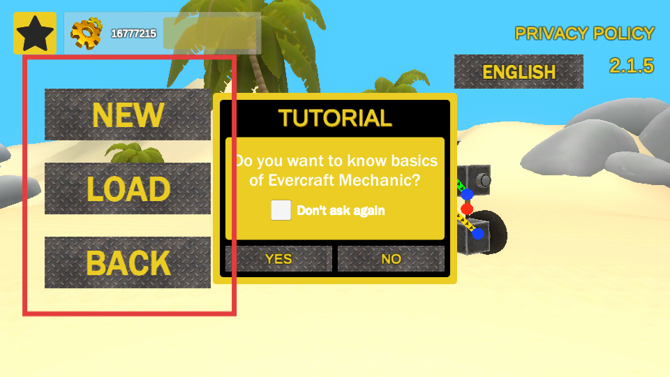 2、若想了解游戲基礎機制,可選擇TUTORIAL,彈出的提示框中選YES,就能學習萬物創造機械師的基本操作,助力玩家后續創作。