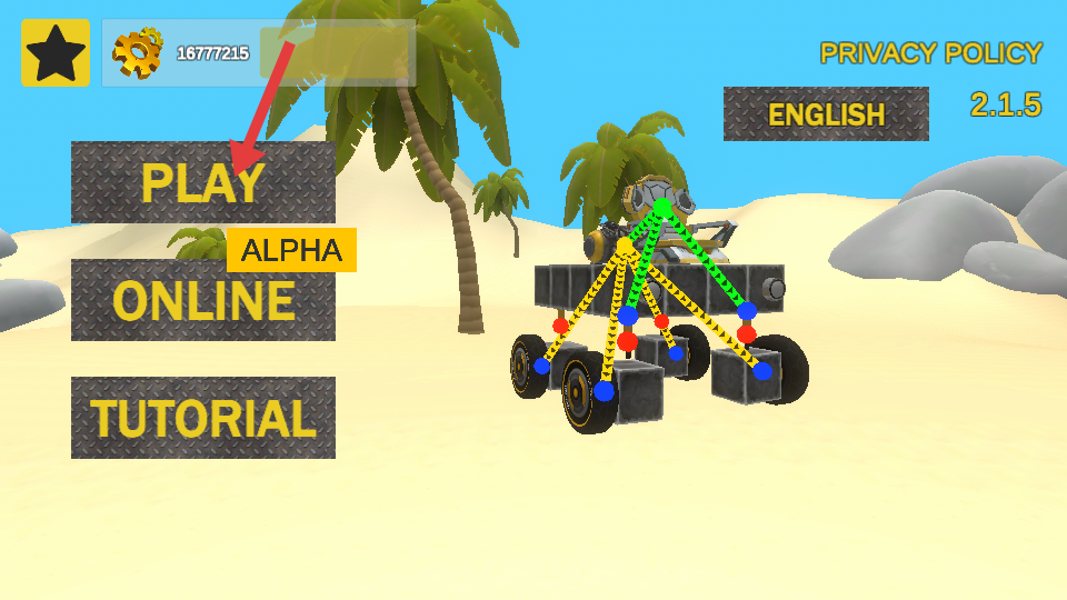 1、游戲主界面有PLAY、ONLINE、TUTORIAL等選項,點擊PLAY可進入游戲,開啟機械創造之旅,體驗搭建機械的樂趣。