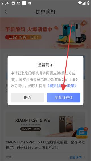 3、在商品詳情頁面彈出的溫馨提示中點擊同意并繼續按鈕,允許獲取手機訪問翼支付權限,繼續查看商品信息。