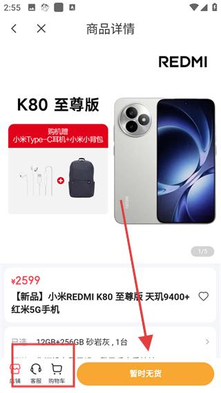 4、在商品詳情頁面,可查看手機的價格、配置、贈品等信息,如REDMIK80至尊版的價格和贈品,若商品暫時無貨,可聯系客服。