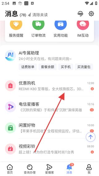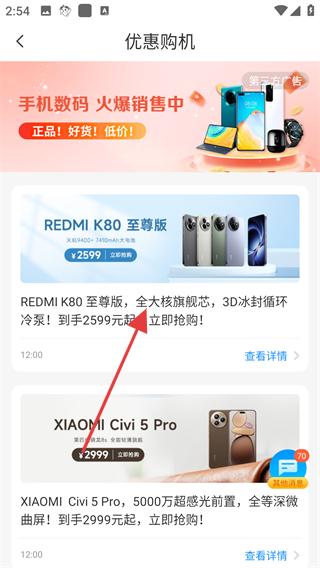 1、打開軟件進入消息板塊可查看各類消息通知,如優惠購機的REDMIK80至尊版信息,點擊進入優惠購機頁面。