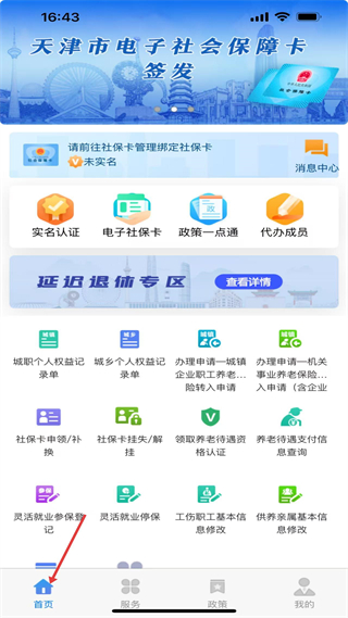 1、首頁是天津市電子社??ǚ杖肟?,可完成實名認證、申領電子社???,辦理權益查詢、補換等業務,是社保服務核心頁。