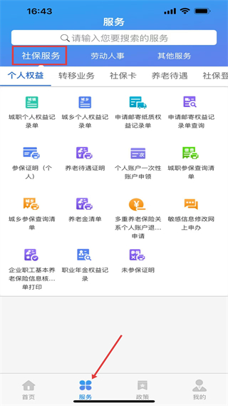 2、服務頁面聚焦社保相關功能,涵蓋個人權益查詢、參保憑證打印等服務,支持搜索定位,便于高效辦理各類社保業務。