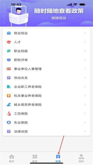 3、政策頁面匯總就業、社保等領域政策分類,可查看各類民生政策詳情,輔助了解社保、勞動人事相關規定。