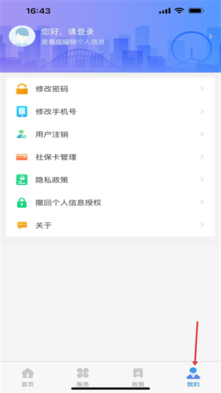 4、我的頁面用于管理個人賬號,支持修改密碼、管理社保卡等操作,可查看或編輯個人信息,是賬號管理核心板塊。