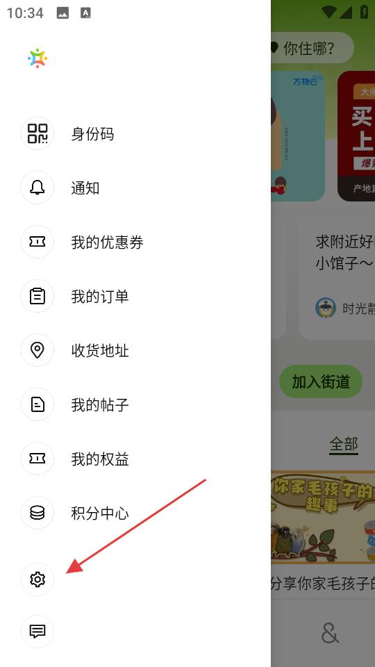 1、個人中心側邊欄有身份碼、通知、我的優惠券等多項功能選項,底部的設置圖標可進入設置頁面。