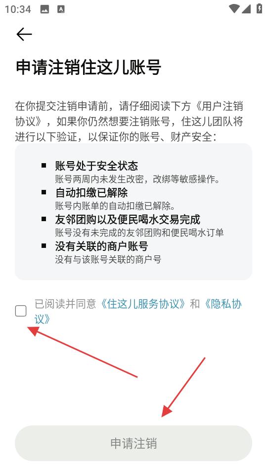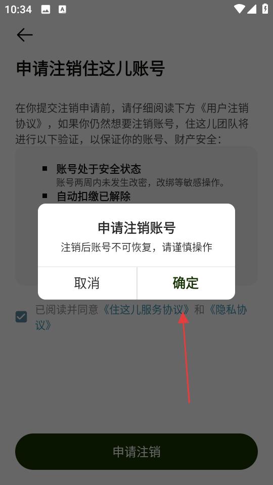3、申請注銷住這兒賬號時,需閱讀并同意住這兒服務協議和隱私協議,頁面還說明注銷前要滿足賬號安全等多項驗證條件。