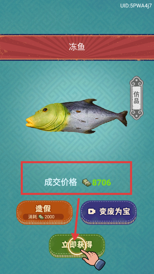 4、鑒定完成后物品會顯示名稱與品質,若為仿品凍魚可看到成交價格,點擊立即獲得就能獲取對應成交價格的資金。