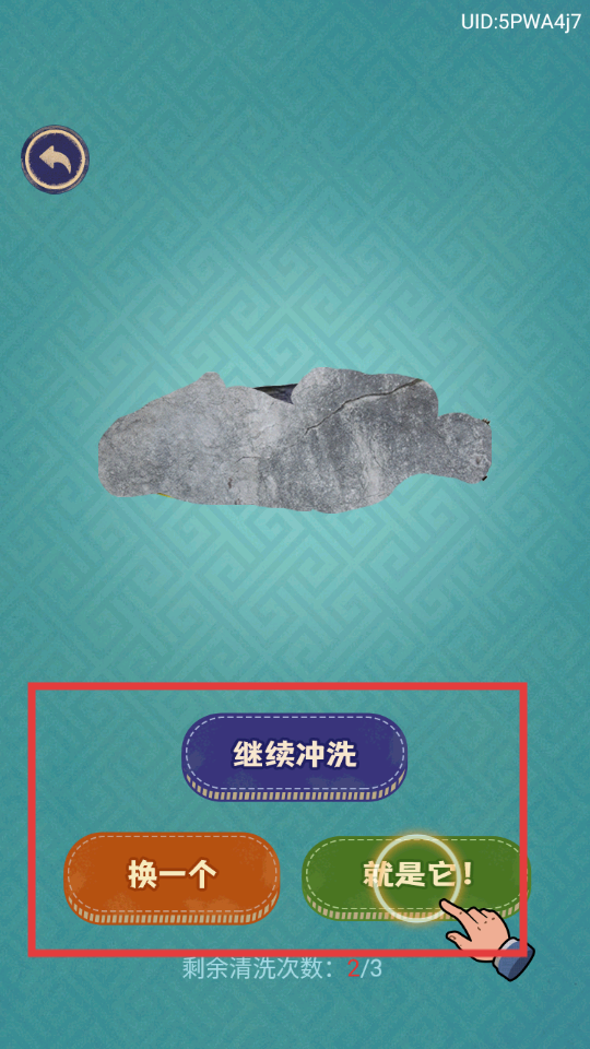 2、挖寶后會出現包裹著物品的石頭,此時有繼續沖洗、換一個、就是它三個選項,若確定物品點擊就是它即可。
