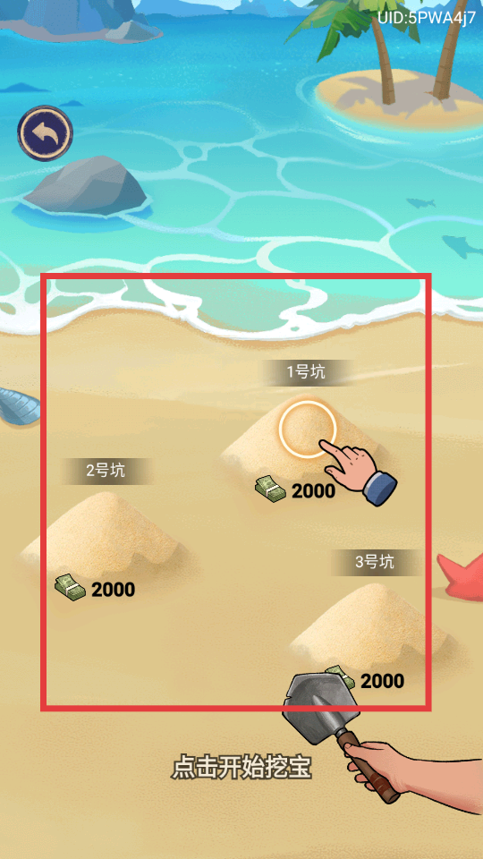 1、玩家進入海灘挖寶場景,有1號、2號、3號坑可選,每個坑挖寶需2000資金,可點擊任意坑,再點擊點擊開始挖寶開啟挖寶。