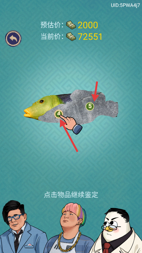 3、物品露出部分樣貌后,會顯示預估價和當前價,此時還需繼續鑒定,按照提示點擊物品上標有數字的位置,推進游戲鑒定流程。