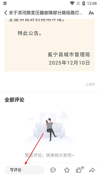 4、瀏覽完公告內容后,點擊寫評論按鈕,進入評論輸入頁面,準備發布自己的看法或留言。