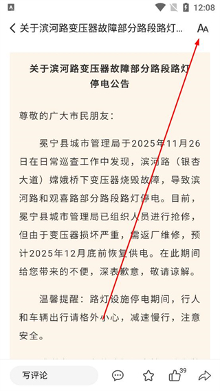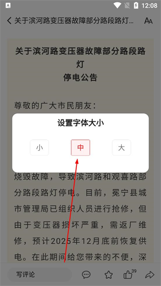 3、調整完字體為中等大小,瀏覽公告的具體內容,了解停電原因及恢復供電的預計時間等信息。
